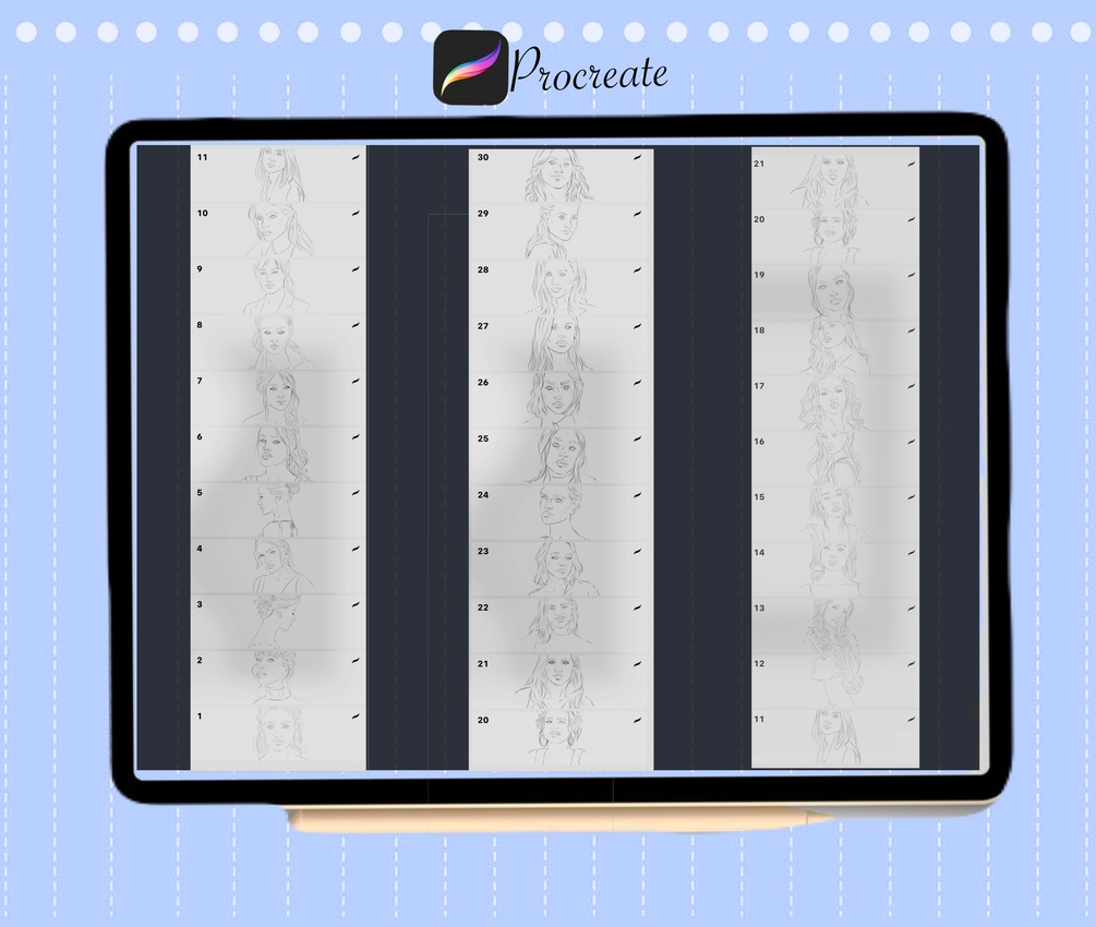 Female face stamp for procreate (set of 30), brushes for procreate. set-4 Portrait brushes. Template for digital art.